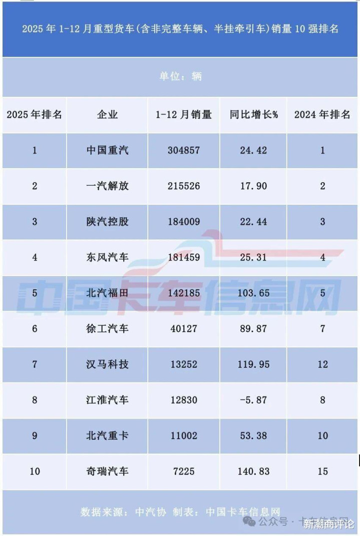 中国重汽1-12月累计销量达到30.49万辆,同比增长24.42%,是2025年唯一一家重卡累计销量突破30万辆的企业,再创历史新高,不仅连续4年保持中国第一(但市占率同比减少0.54个百分点至26.63%),更勇夺全球重卡销量第一桂冠。